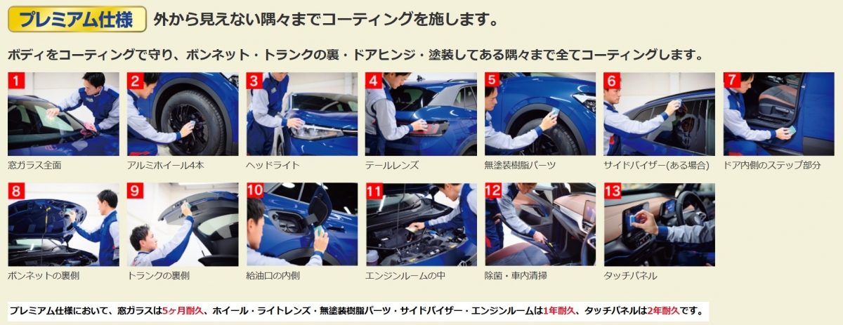 プレミアム仕様ではボディ塗装面に加え、①窓ガラス全面 ②アルミホイール4本 ③ヘッドライト ④テールレンズ ⑤無塗装樹脂パーツ ⑥サイドバイザー ⑦ドア内側のステップ部分 ⑧ボンネットの裏側 ⑨トランクの裏側 ⑩給油口の内側 ⑪エンジンルームの中 ⑫除菌・車内清掃 ⑬タッチパネル