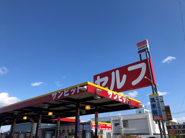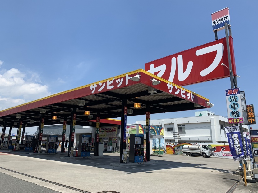 国道190号線沿い、大きな「セルフ」の赤い看板が目印のサンピット宇部店です。