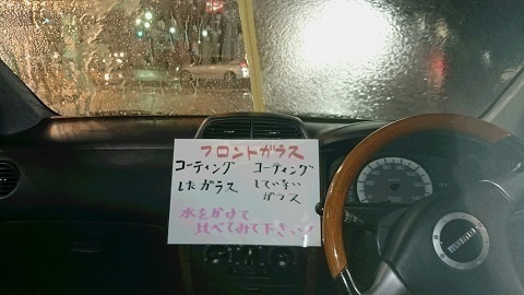 お客様に室内に乗って頂き左右の撥水 の違いを体験してもらいます。 「ワオォー!スゴイ!」「感動!!」