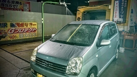 フロントガラスを中央より半分コーティングし シャワーを掛けます。