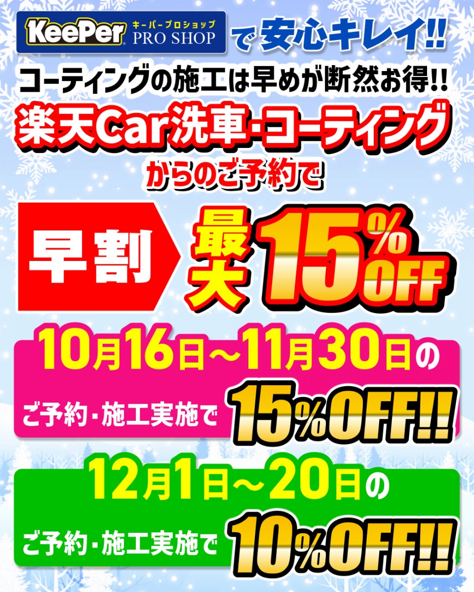 10月16日より年に一度の最大割引【早割】を開始します!◆10月16日~11月30日の期間中、楽天Car洗車・コーティングからのご予約で対象のコーティングが15%OFF!!◆12月1日~20日の期間中...