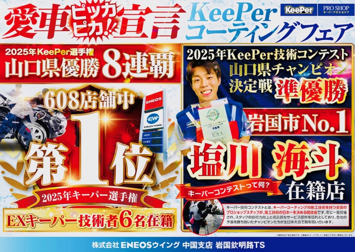 山口 岩国 玖珂 周南 牛野谷 麻里布 南岩国 錦見 柱野 大竹 光 室の木町 西岩国 コーティング キーパー KeePer きーぱー ピュアキーパー クリスタルキーパー ダイヤモンドキーパー ダブル 手洗い シャンプー きれい キレイ 綺麗 ディーラー ミネラルオフ 洗車 洗車機 セルフ ガソリンスタンド ガソスタ ENEOSウイング ENEOS エネオス 一光 鈴代 撥水 プリズム コート 輝き