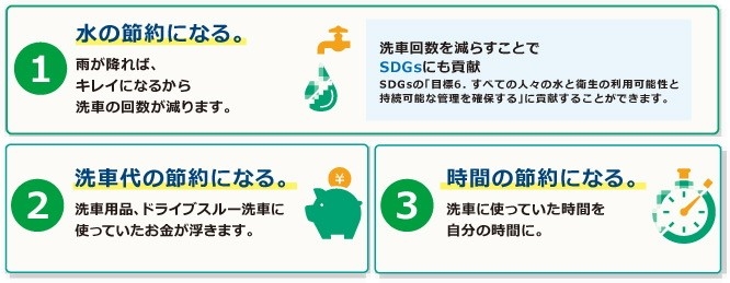 ● 自然の雨が洗車の代わりになる。洗車の回数がぐんと減ります。「洗車は嫌い」という方にピッタリ。