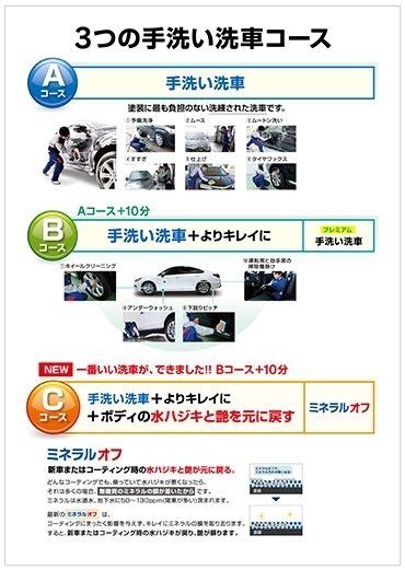 Bコースの手洗い洗車のコースに加えミネラル膜(撥水阻害被膜)を
