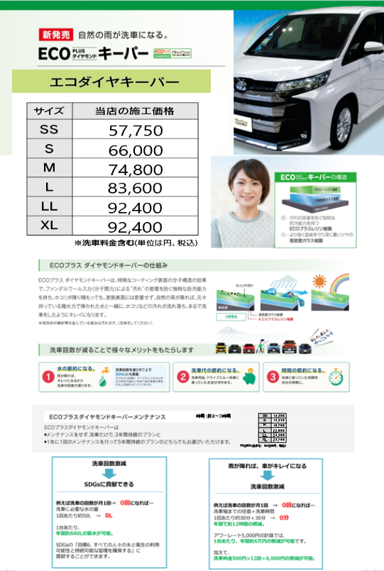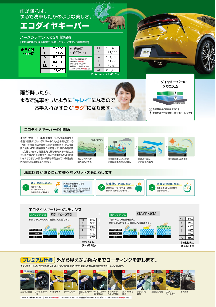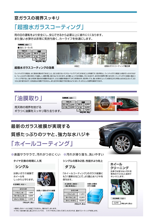 ホイールコーティングでは、ブレーキダストなどによる鉄粉、油汚れを付きにくくし、ホイールへの汚れの固着をふせぐので、毎回の水洗いで“キレイ”を長持ちさせてくれます。