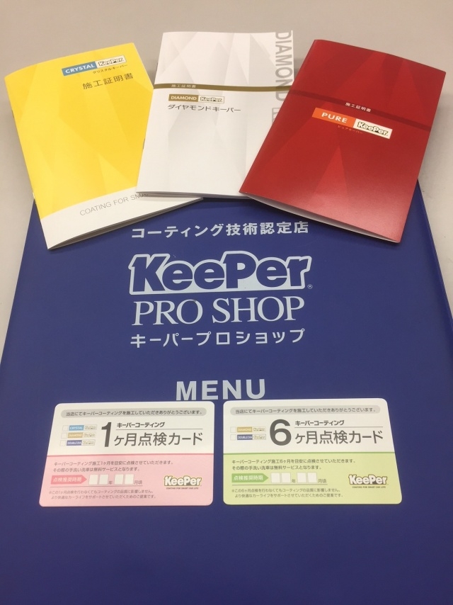 コーティングを施工させていただいたお客様に、コーティング施工証明書を発行しお渡ししています。いつコーティングをし、次回がいつなのかの管理や、普段のお手入れの仕方まで書いてあるのでご自身で洗車される方にも安心です!また、コーティング施工1ヶ月目、6ヶ月目に無料で手洗い洗車が出来るカードもお渡しさせていただいてますので、施工後のフォローもお任せください!また、万が一お車を鈑金、塗装をする事になってしまった場合、この証明書があれば、保険対応できる場合がございます。詳しくは、当店へご相談ください。