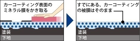 コーティング ケアはKeePerが発明した、このミネラルの膜だけを、キレイに取る技術。元のコーティング本来のツヤが戻り、水もはじくようになります。