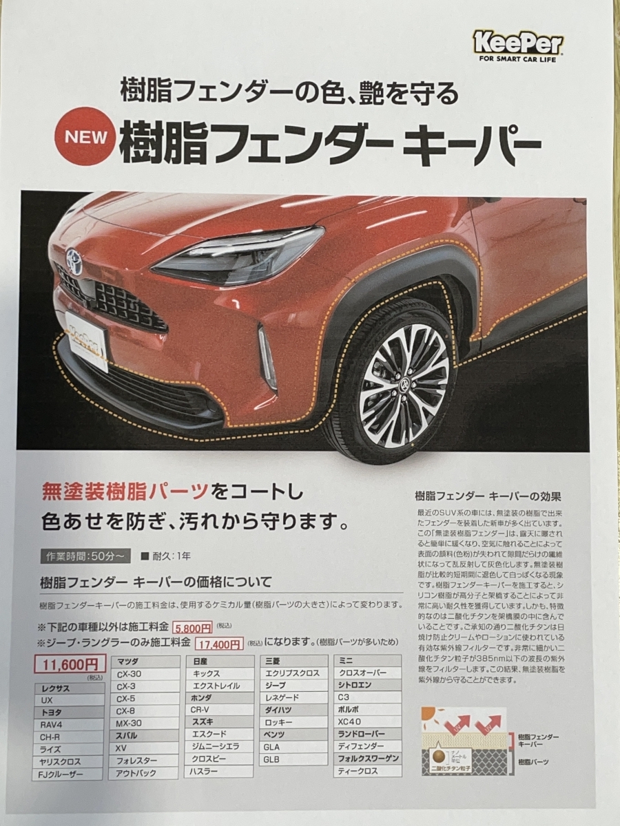 白ぼけてしまった樹脂部分も、本来の色と艶を取り戻すことができます。施行前と施行後の比較もあります。左が施行後、右が施行前となり見た瞬間に違いがわかります。
